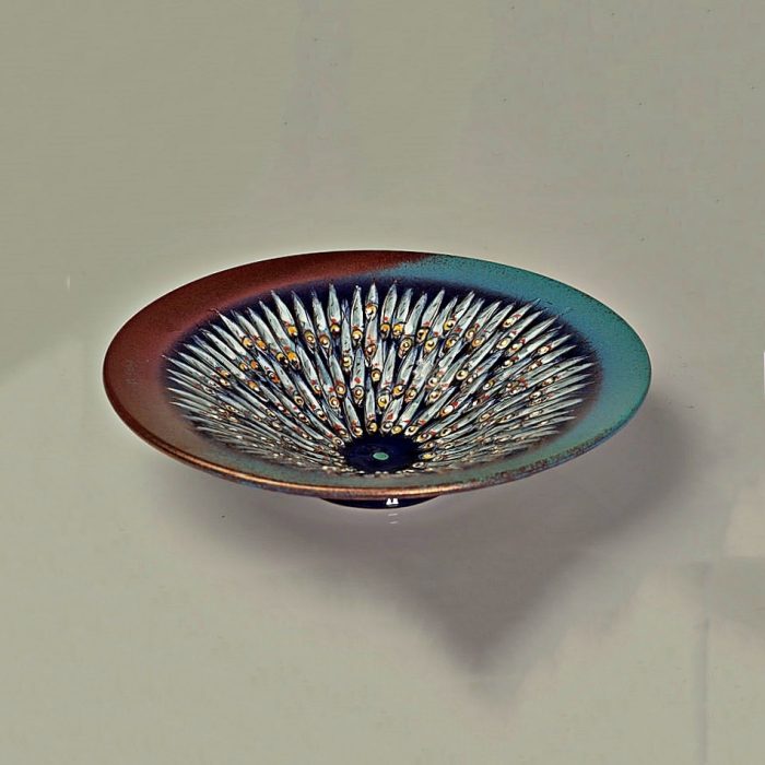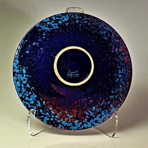 Various shades of blue, bronze, copper, navy, red and yellow/hand-painted ceramic