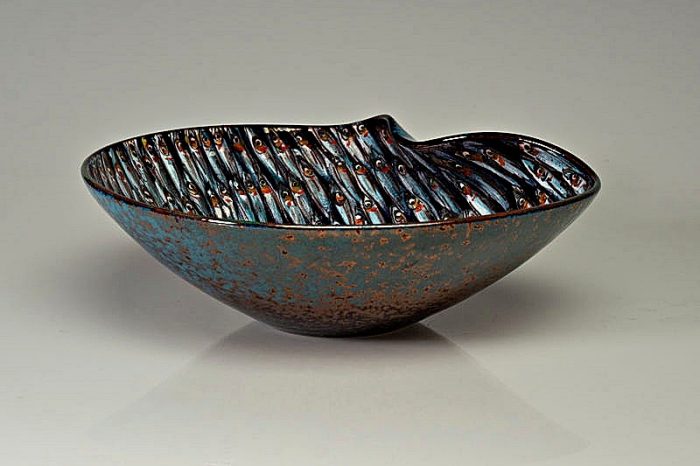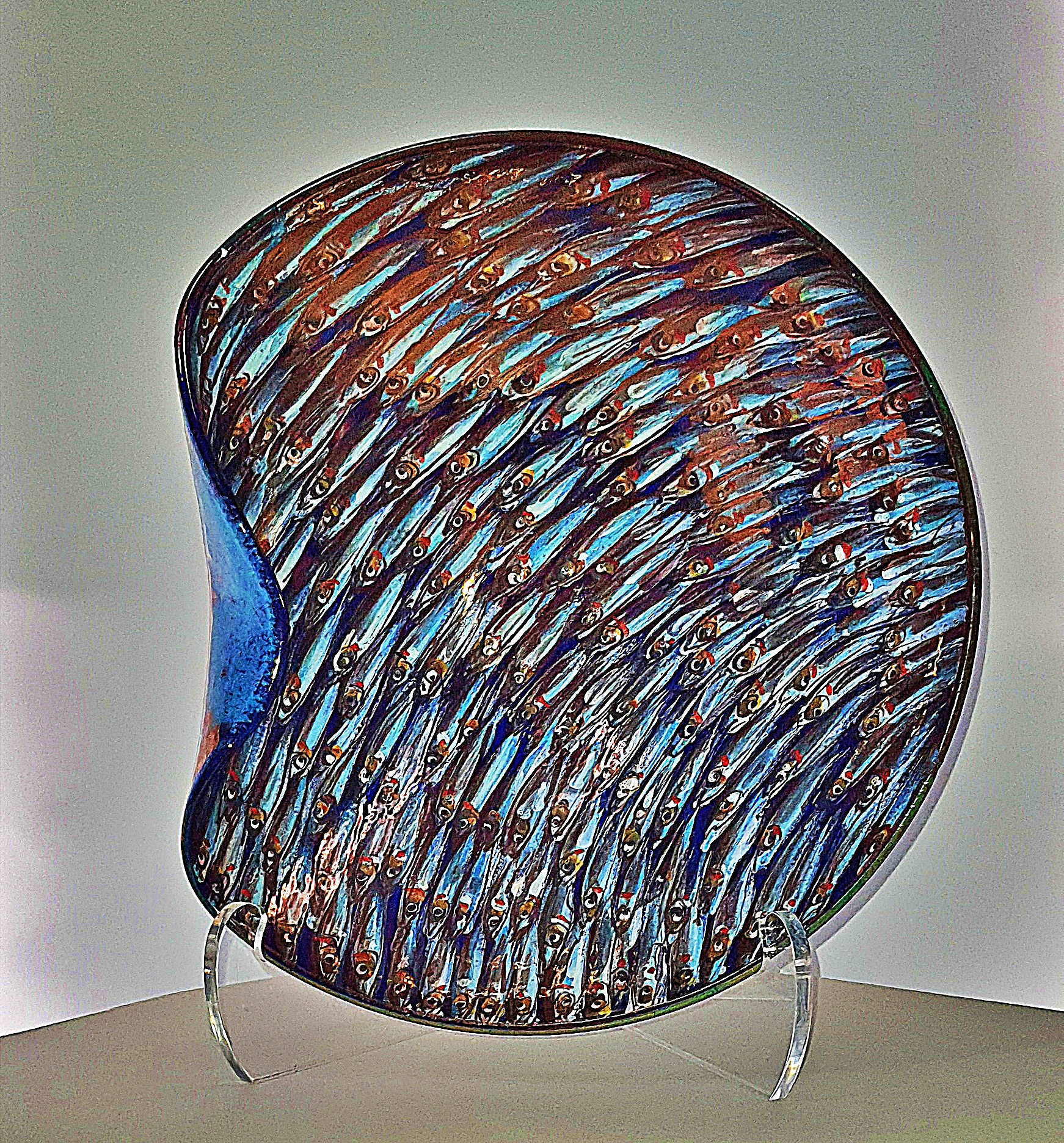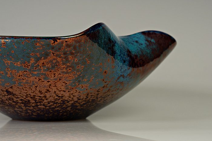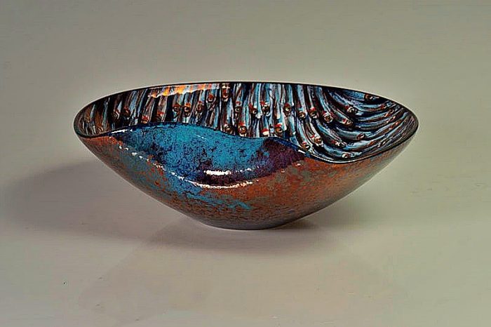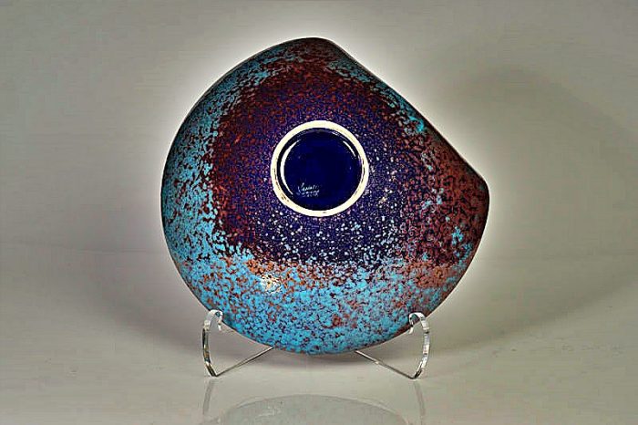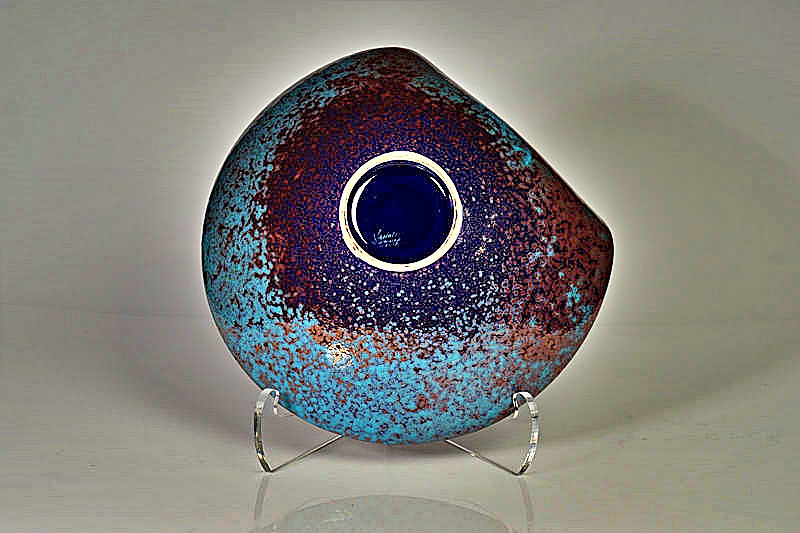 Various shades of blue, bronze, copper, navy, red and yellow/hand-painted ceramic