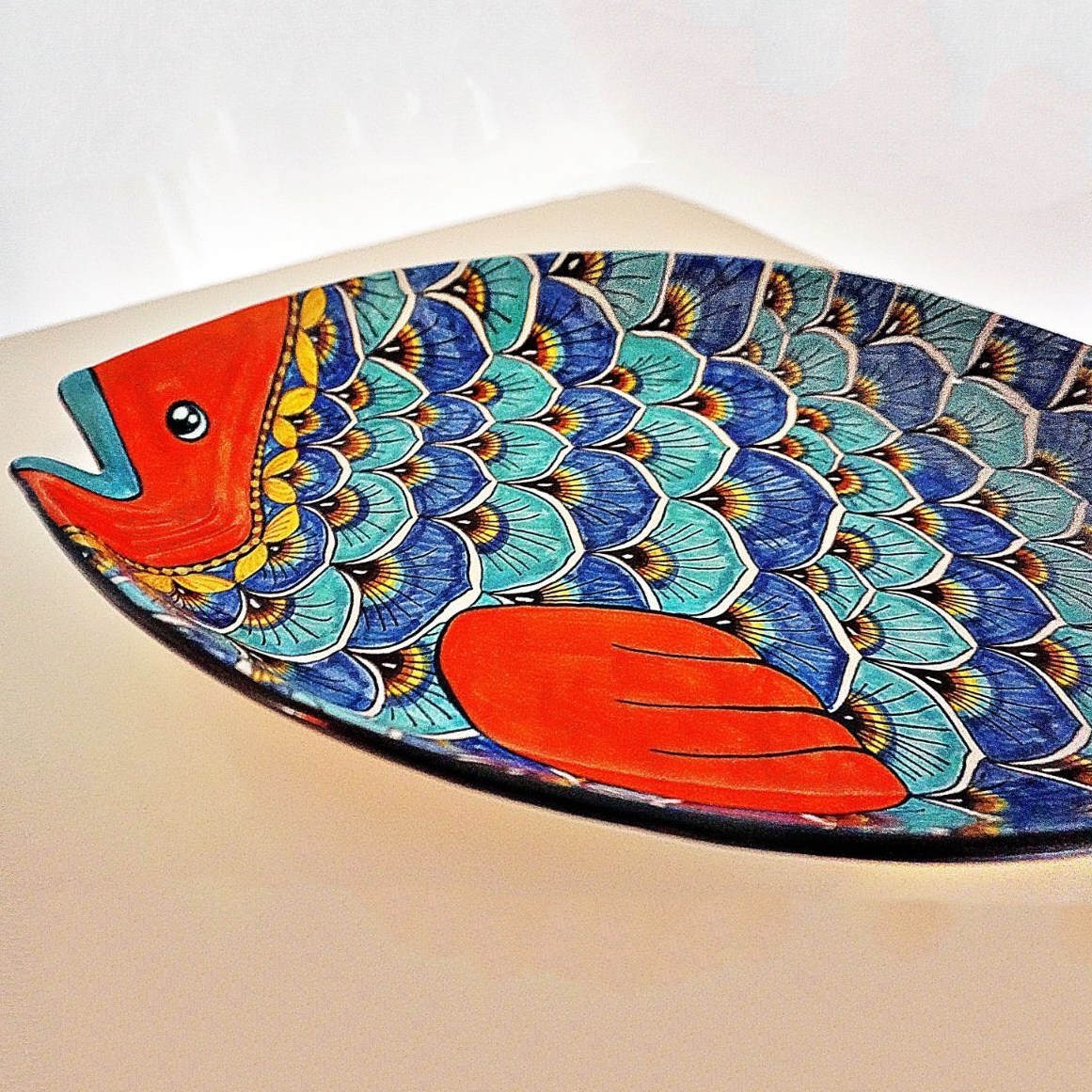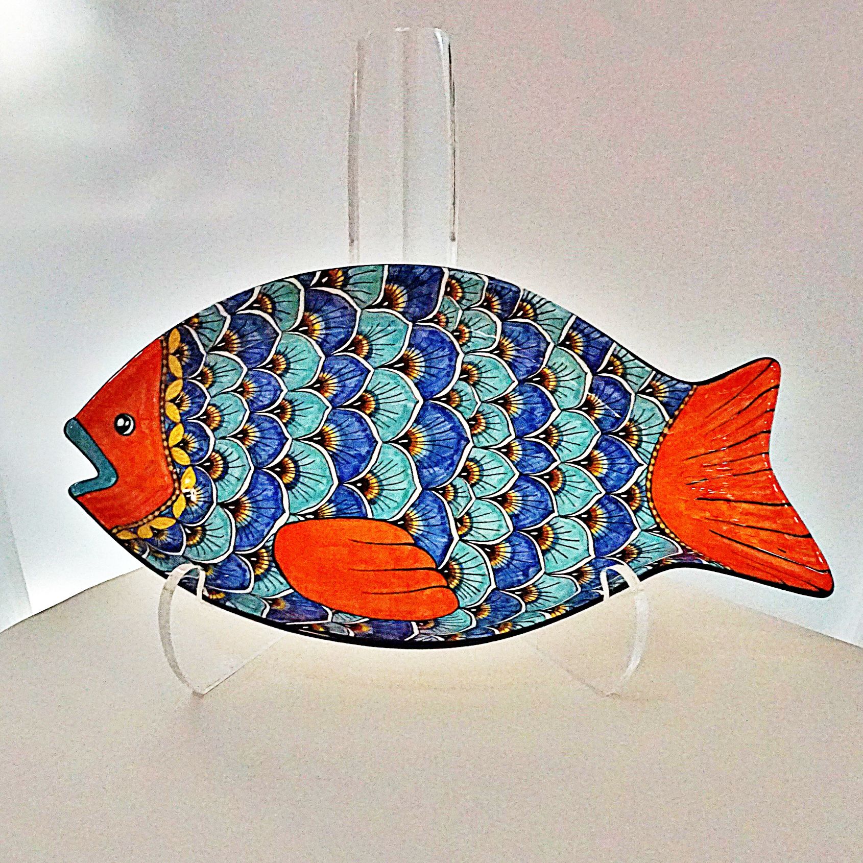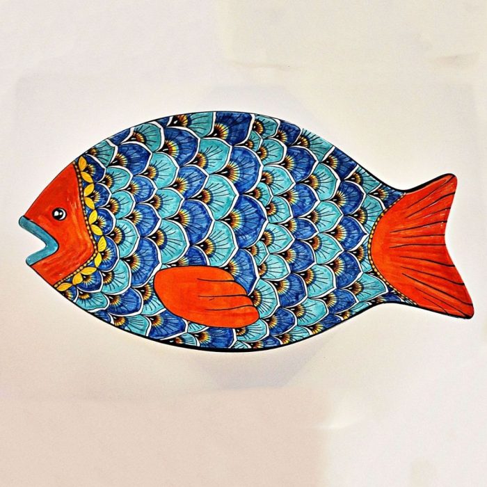 A tribute to the painterly creativity of our artisans in Deruta, Italy, this enchanting fish platter features aqua blue scales and an orange face, fin, and tail. The blue and orange combination makes this piece particularly striking to the eye.