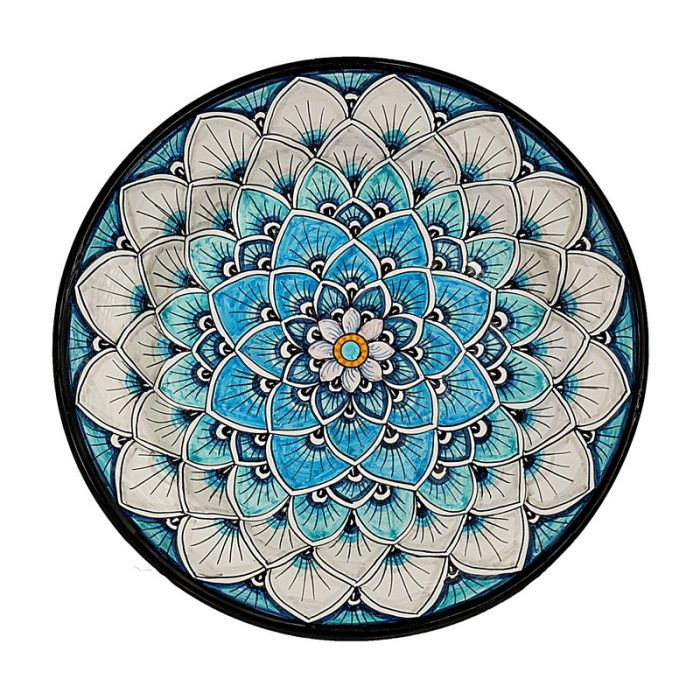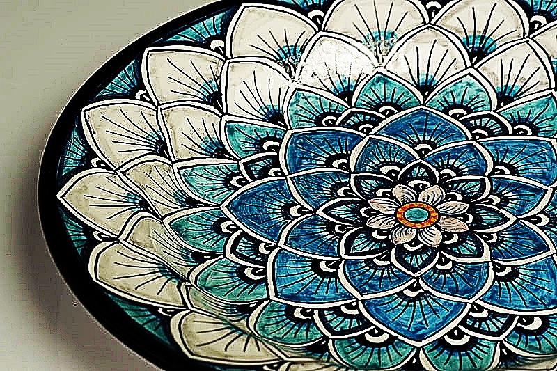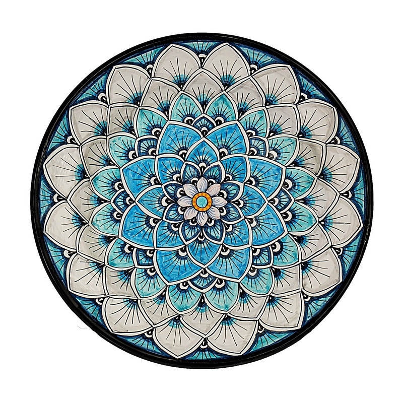 This platter has a leaf pattern of shades of blue and aqua. These colors are meant to capture the bright Italian skies over Umbria. The center of the piece is a gold color starburst petal leaf.