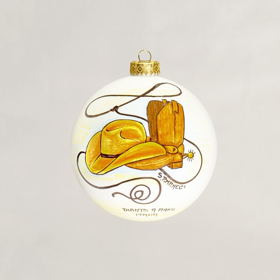 Our Italian craftsmen at Deruta capture the flamboyant Texas spirit with this fun and lively rendition of a traditional Texas Stetson-style cowboy hat, cowboy boots and lasso.  This Christmas ornament will give your tree a true Texas flair!