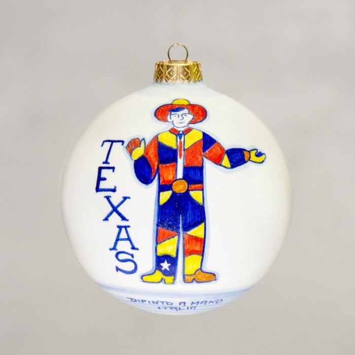 Our Italian craftsmen at Deruta capture the flamboyant Texas spirit with this fun and lively rendition of a welcoming Texas cowboy. This Christmas ornament will give your tree a true Texas flair!