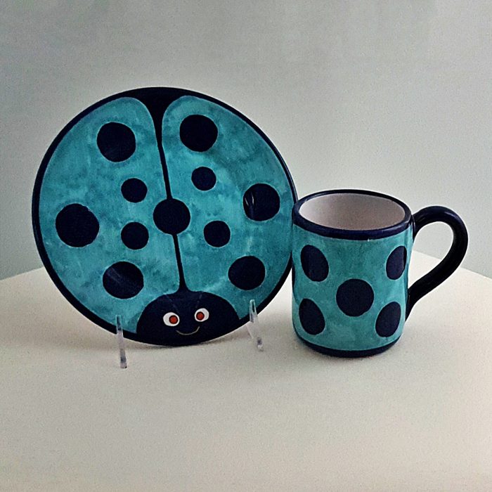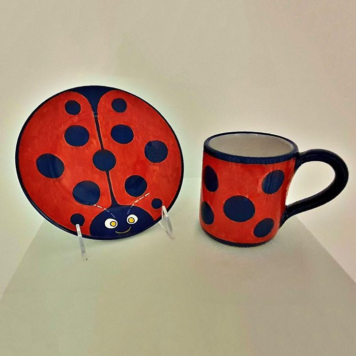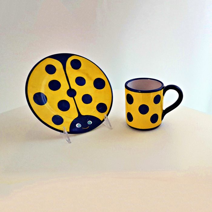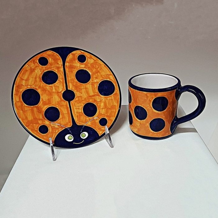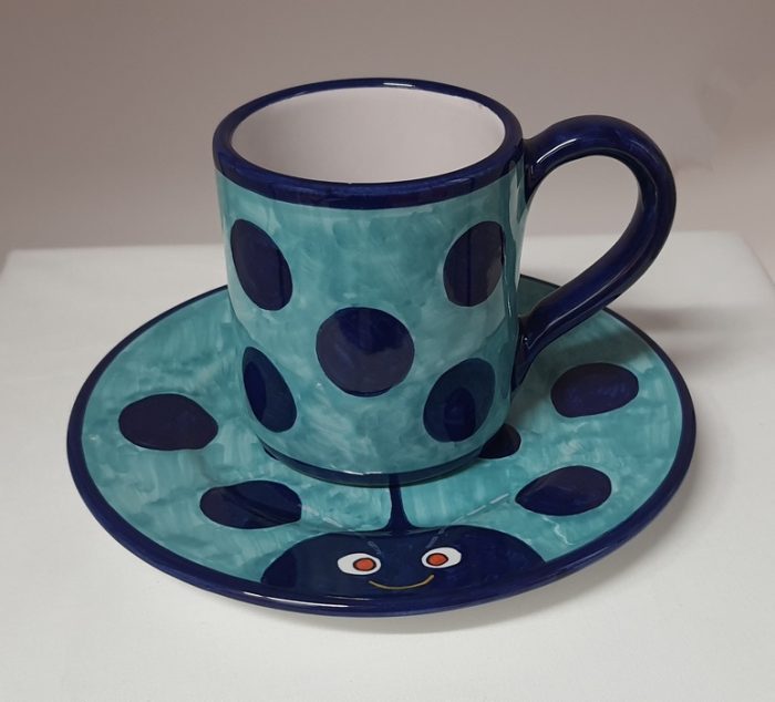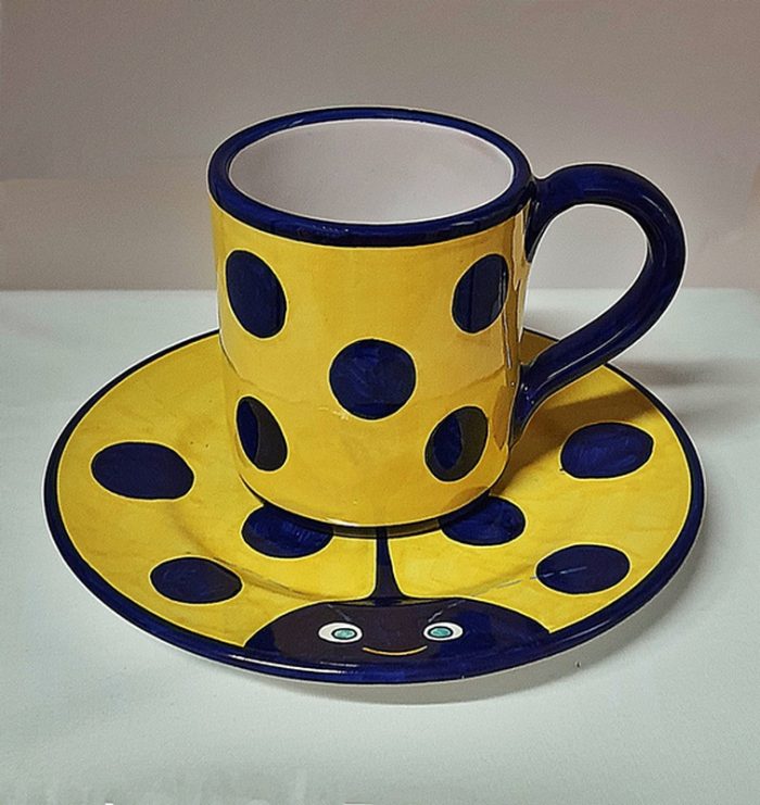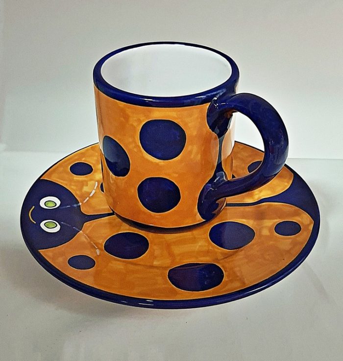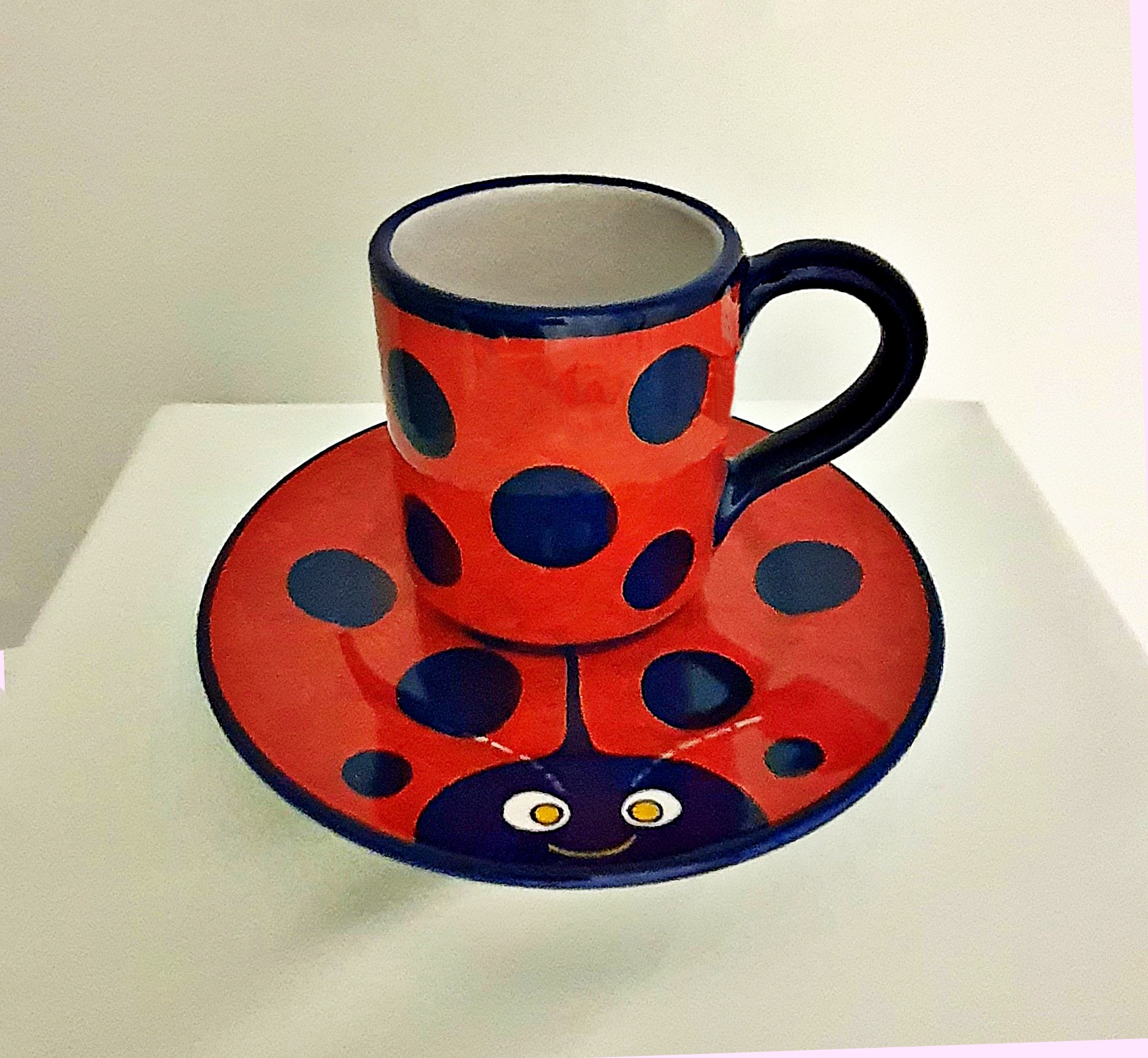 Beautiful lady bug coffee mugs and saucer sets, hand painted and hand crafted in Deruta, Italy.