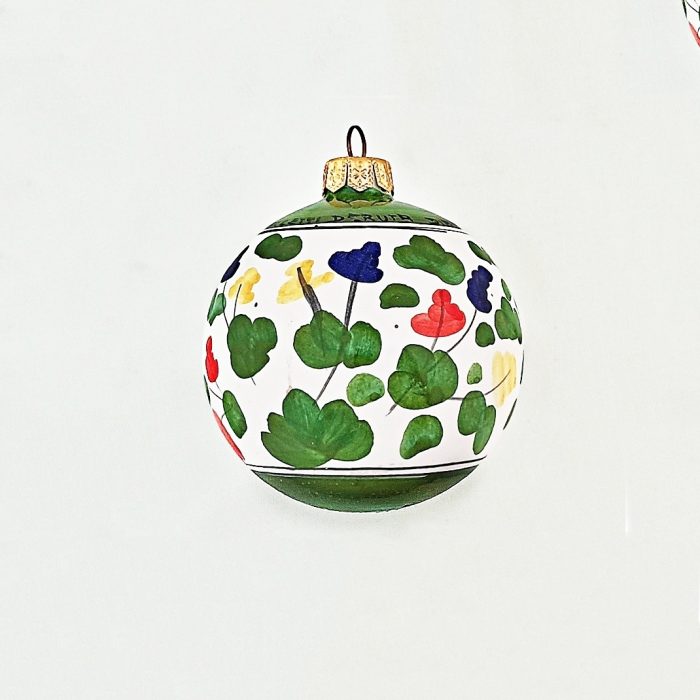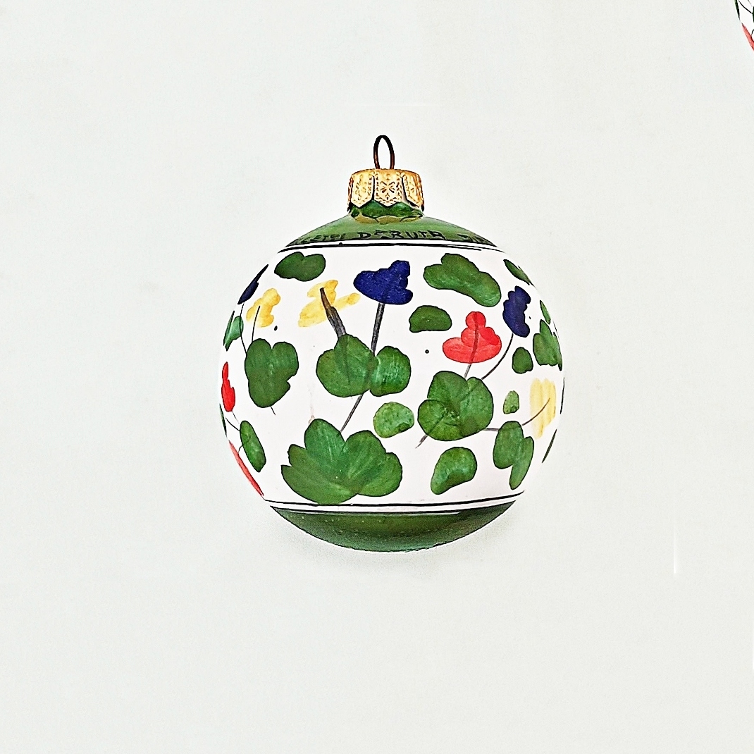 This round floral pattern Christmas ball is a colorful display of Arabesque influence. These hand painted flowers circle the ball in a delightful dance.