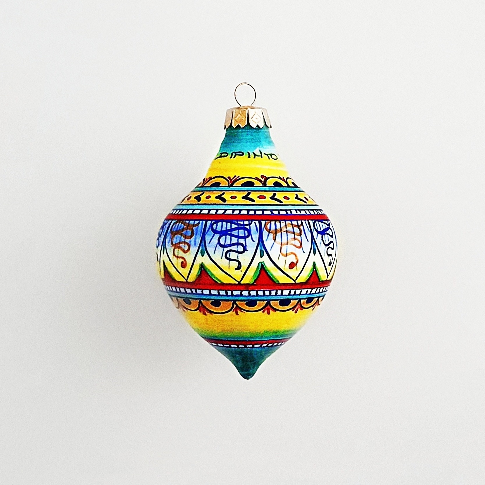 This lavish, hand-painted multi-colored teardrop shaped Christmas ornament is truly a work of art! The amazing designs featured on this ball are decorative motifs typical of Deruta and central Italy.