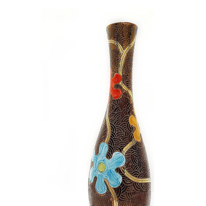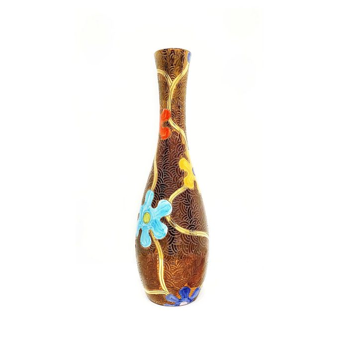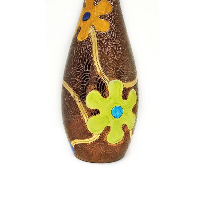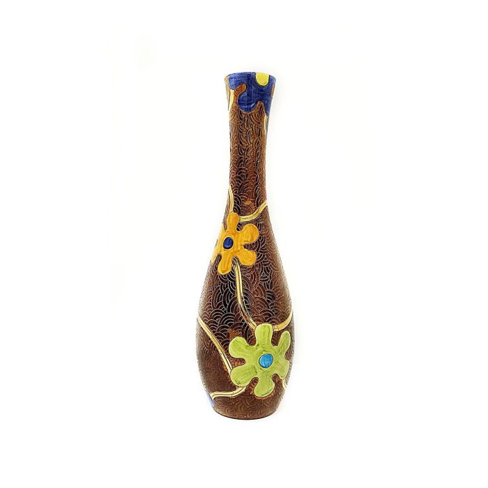This flower design vase is entirely handmade in three complex stages. In the first phase, once the basic shape of the object has been formed from the indigenous red clay of the region, highly ornate designs are engraved or incised by hand with a steel point onto the soft clay surface. The engraved designs are patterned after decorative motifs of the Byzantine Empire and other ancient civilizations from the Mediterranean Basin. The object is then fired at a high temperature to create the hardened “biscuit” form.