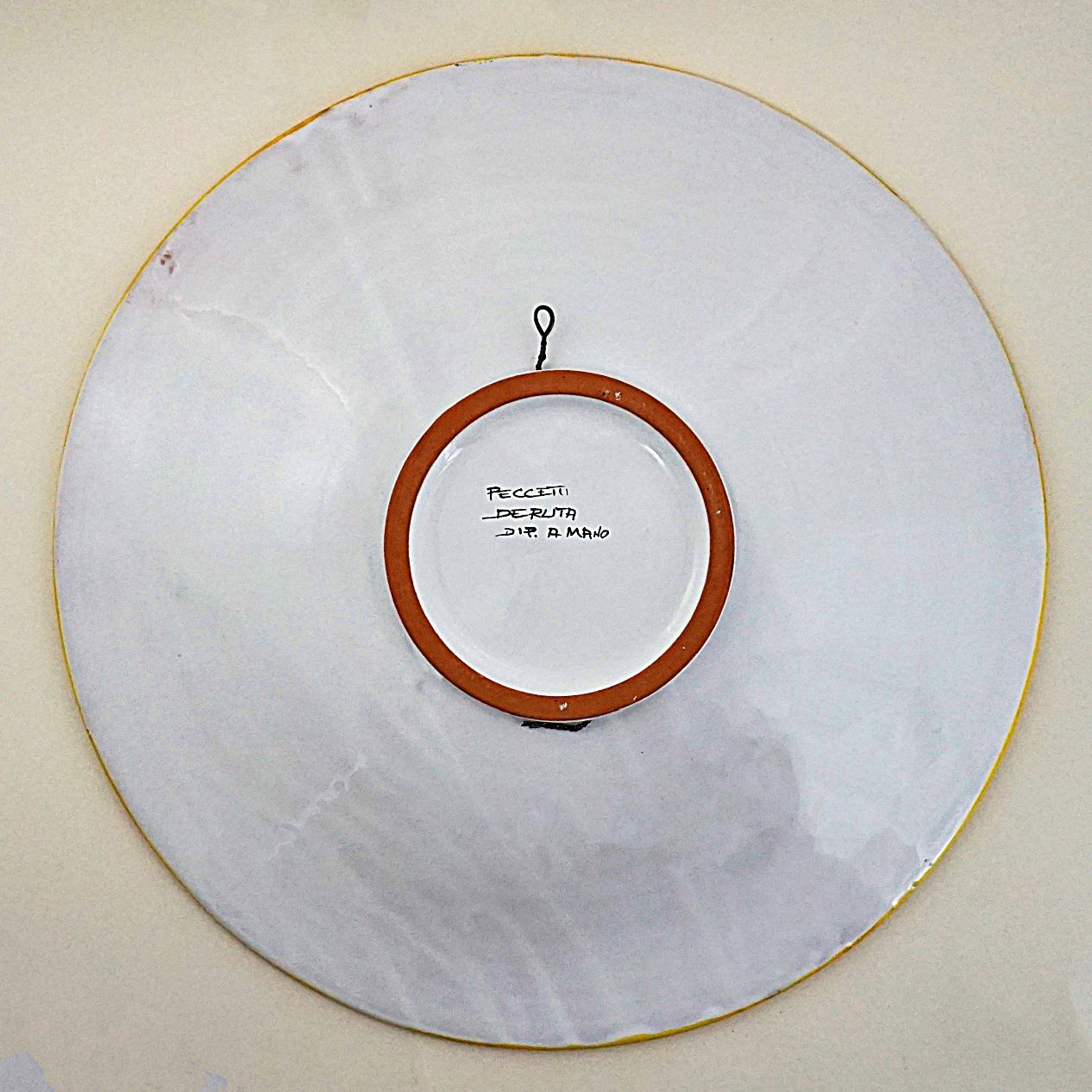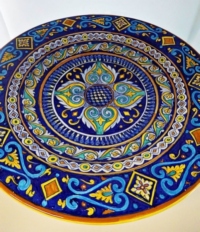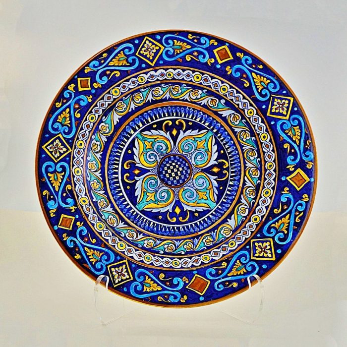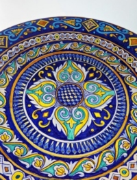 Bold expression is what defines this large-scale hand-painted centerpiece platter. The exceptional, intricate, design is based upon ancient Italian Renaissance decorative motifs. Vibrant hues of blue are accented by gold, aqua and brown geometric shapes. This important collector’s piece can be used either as a functional food serving platter or as an impressive wall hanging.