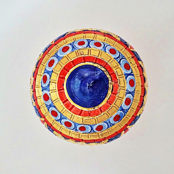 Shades of blue, red, white and gold leaf/hand painted ceramic