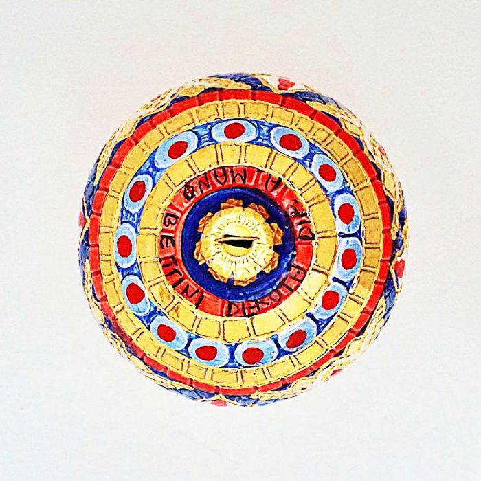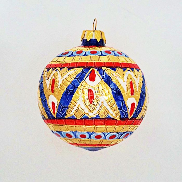 This very unique, hand made and hand designed, Christmas ornament reflects the season with a spectacular tiled design highlighted by 24 carat gold leaf. Add true opulence to your tree with this unusual ornament.