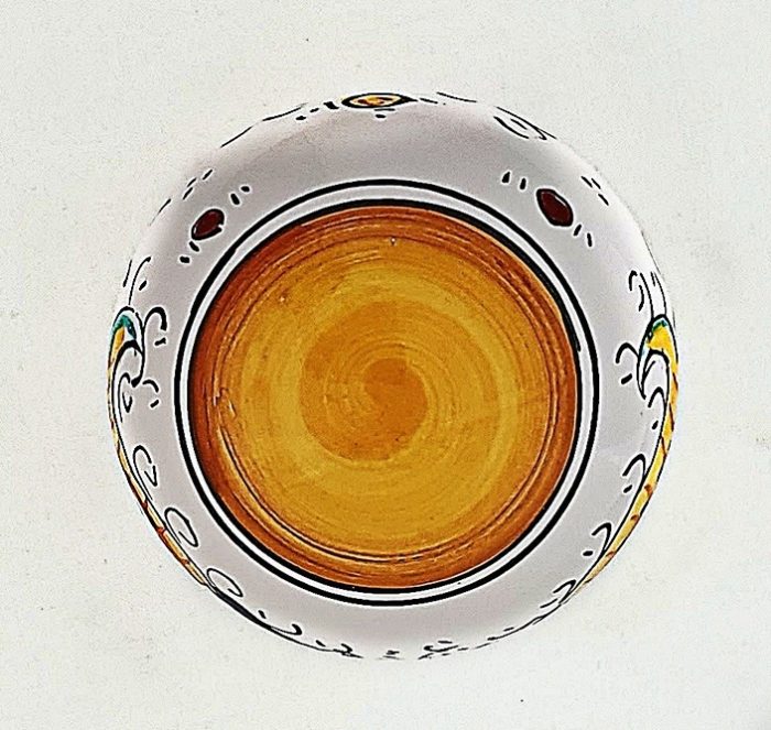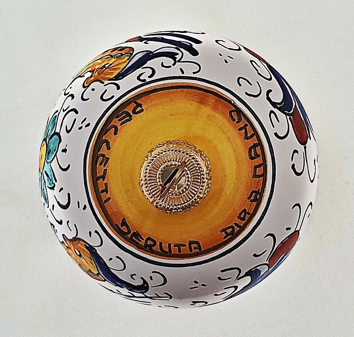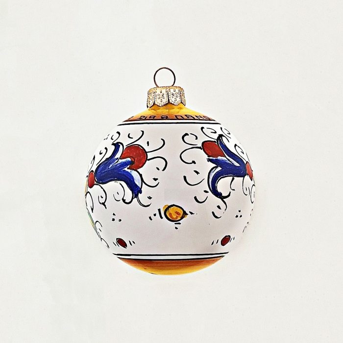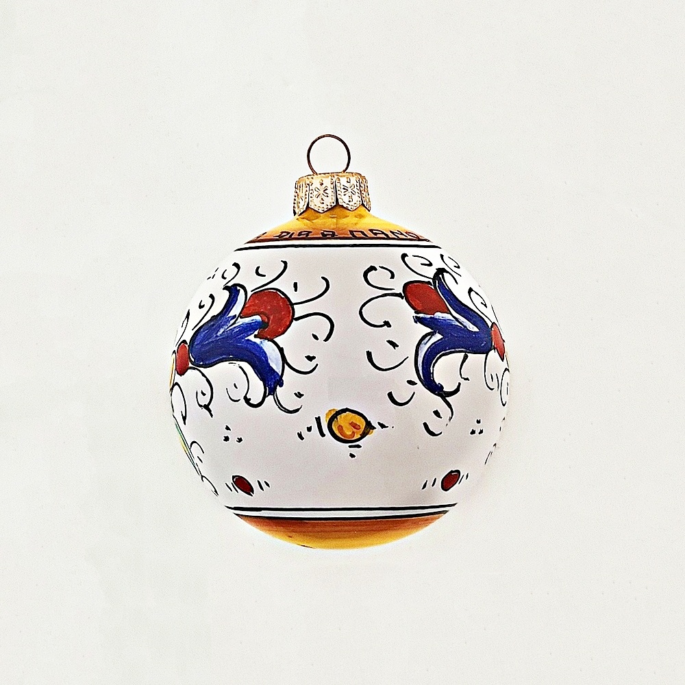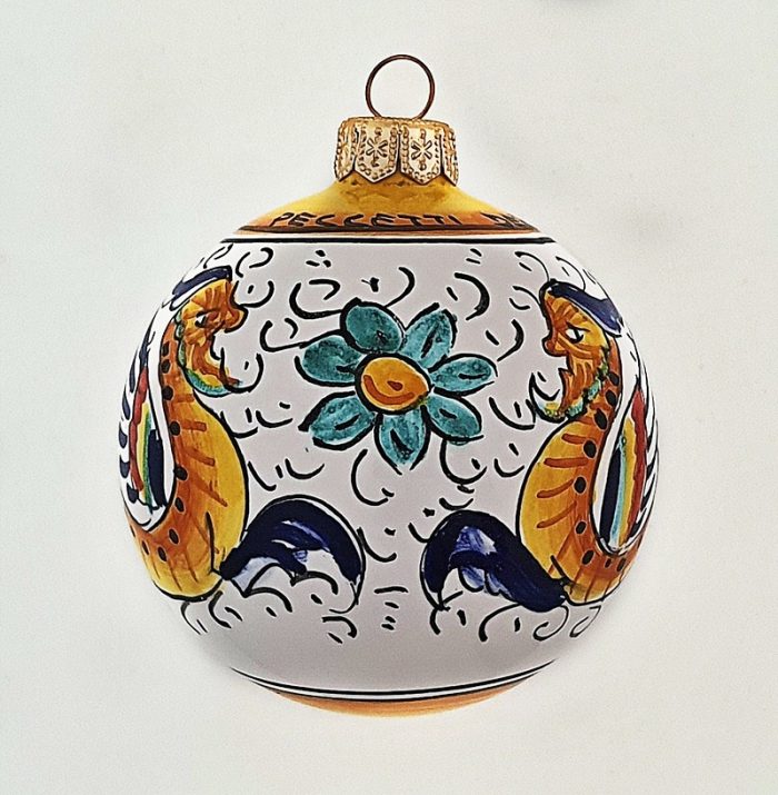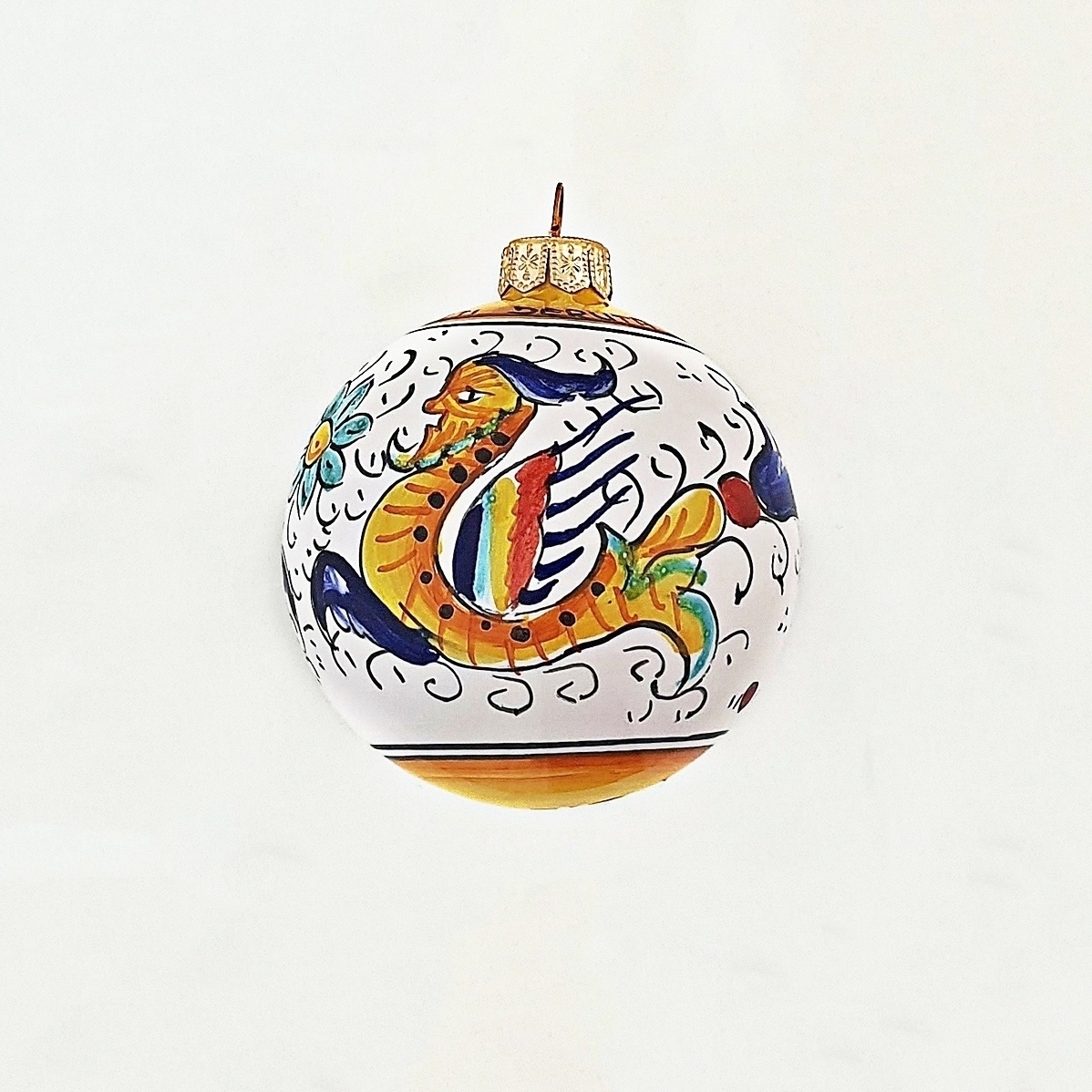 This round Christmas ball hand made by our artisans in Deruta, Italy, captures a Renaissance-inspired mythical theme of unusual half – man, half – bird creatures. An unusual combination of colors tantalizes the eye.