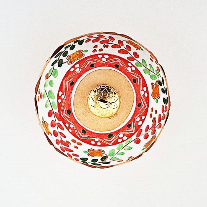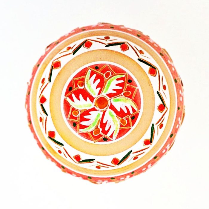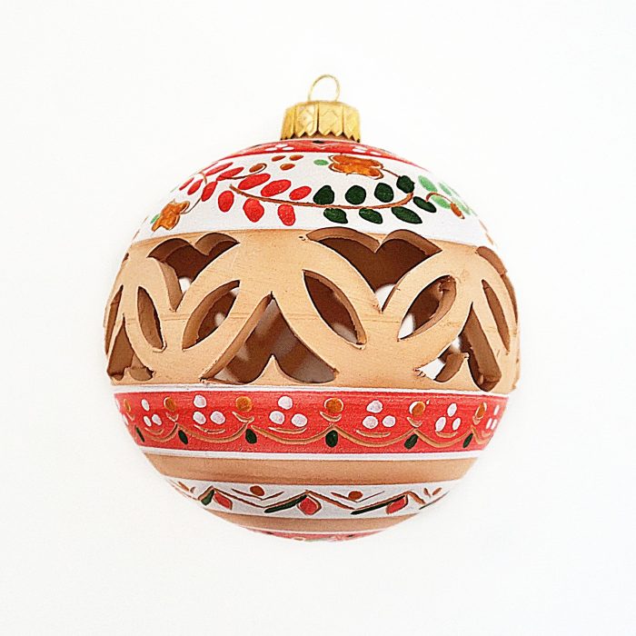 This very unique ornament is made from the indigenous red clay of Siena, Italy. It is hand sculpted and hand painted in a delightful play of flower-shaped window pane patterns. These window panes allow the eye to see through the ball itself!