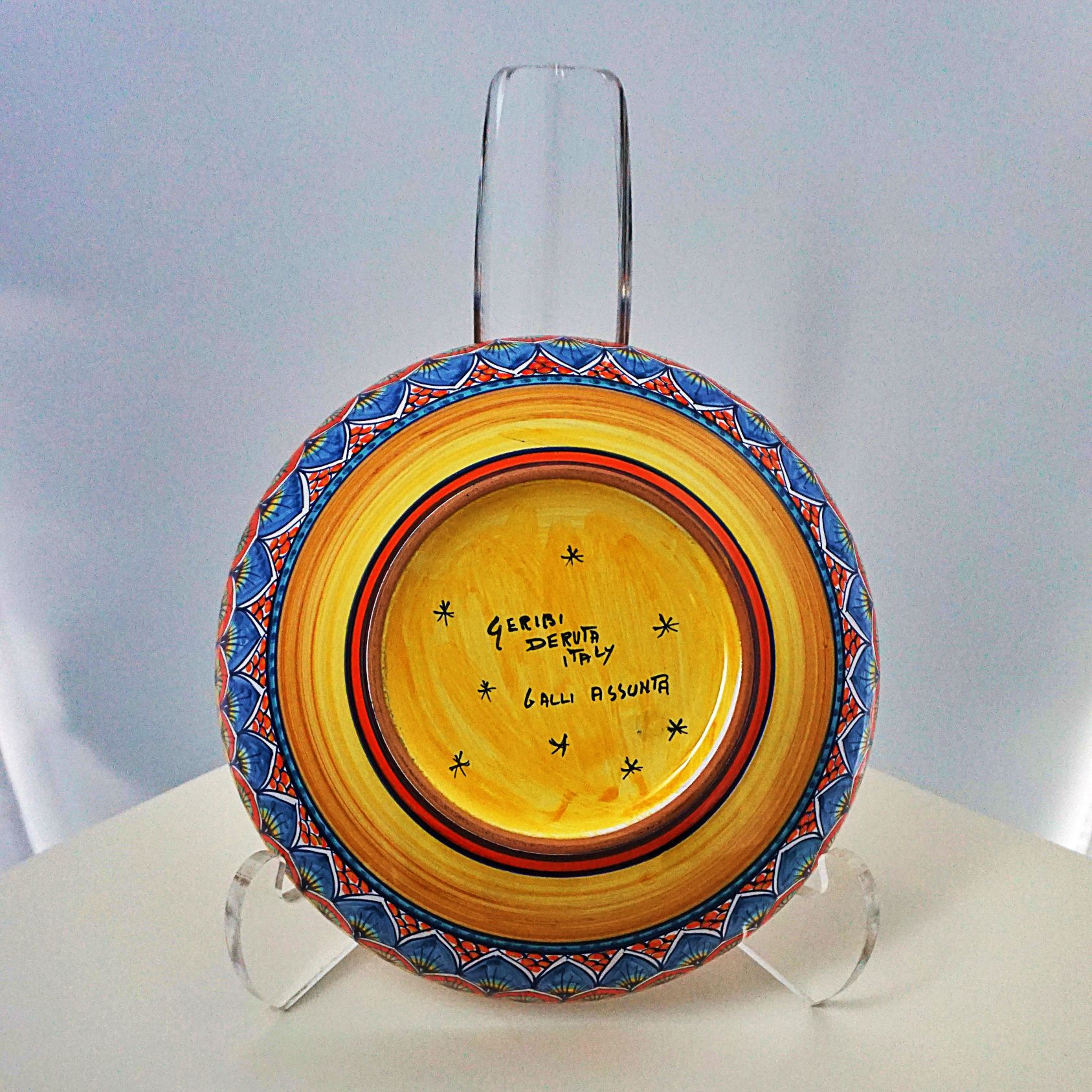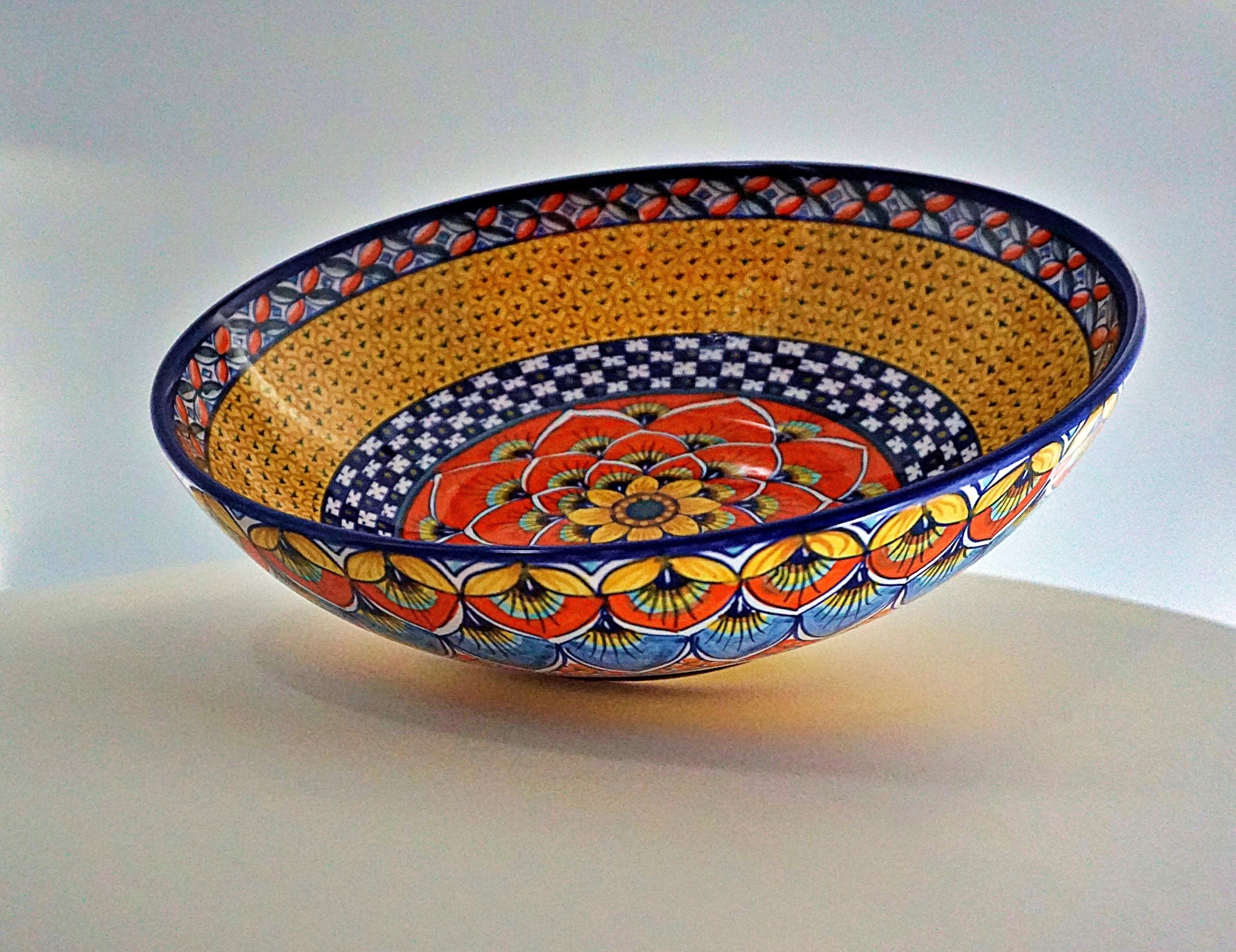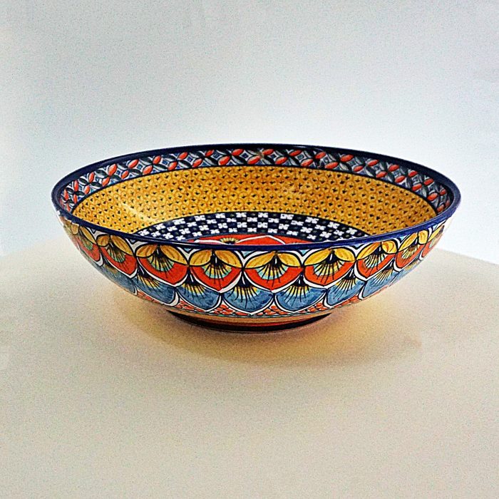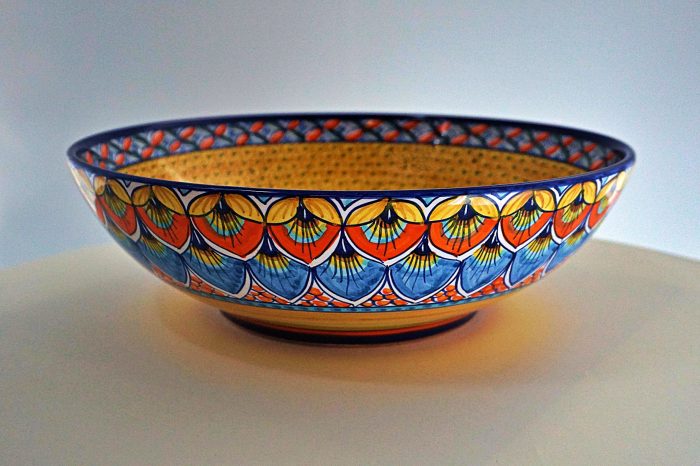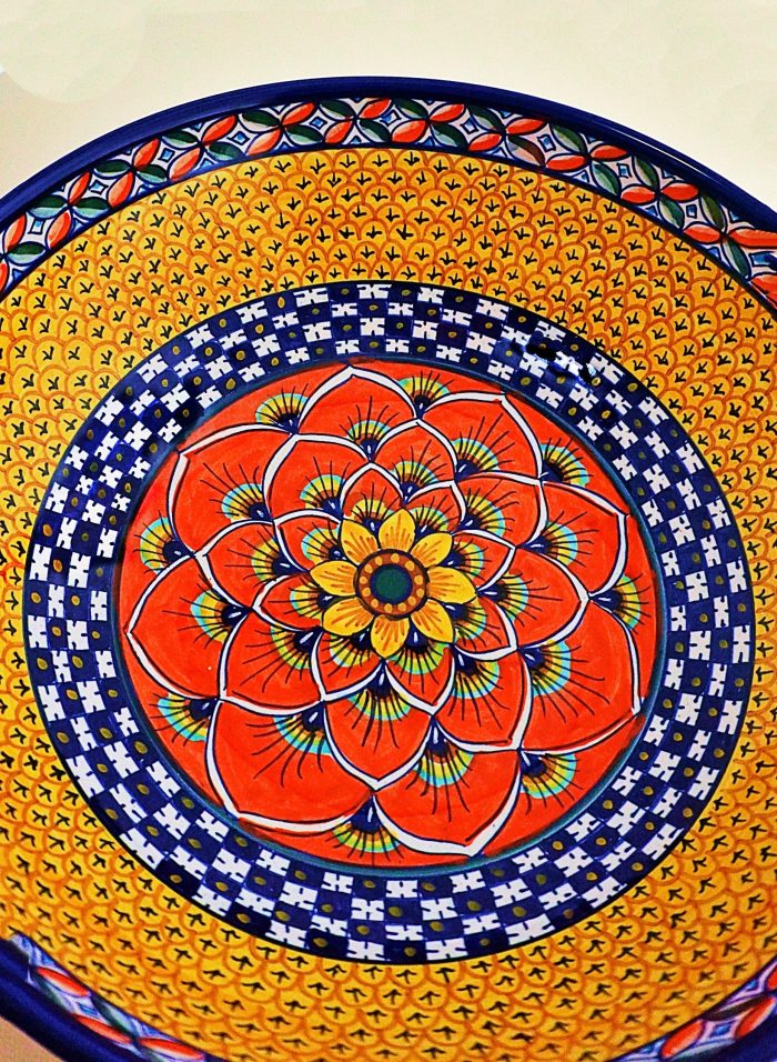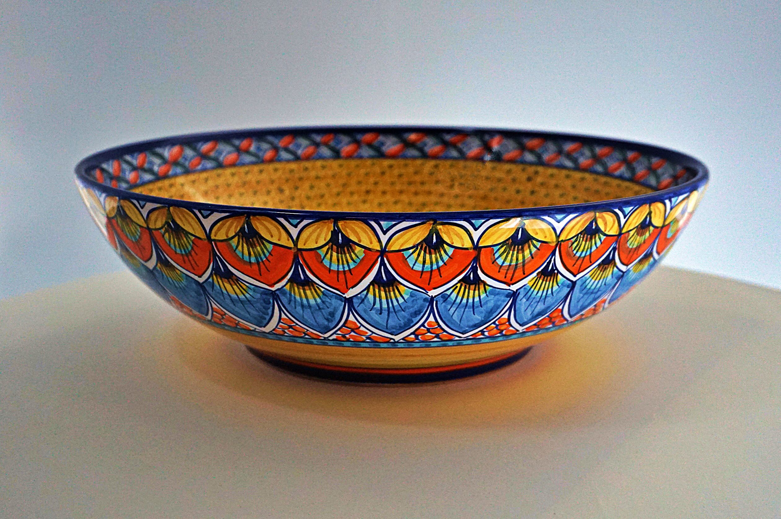 Orange, yellow, red, dark blue, green/hand-painted ceramic