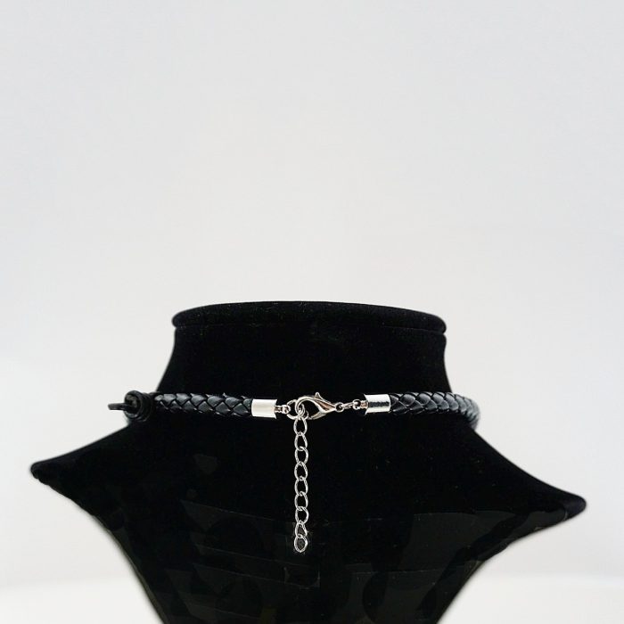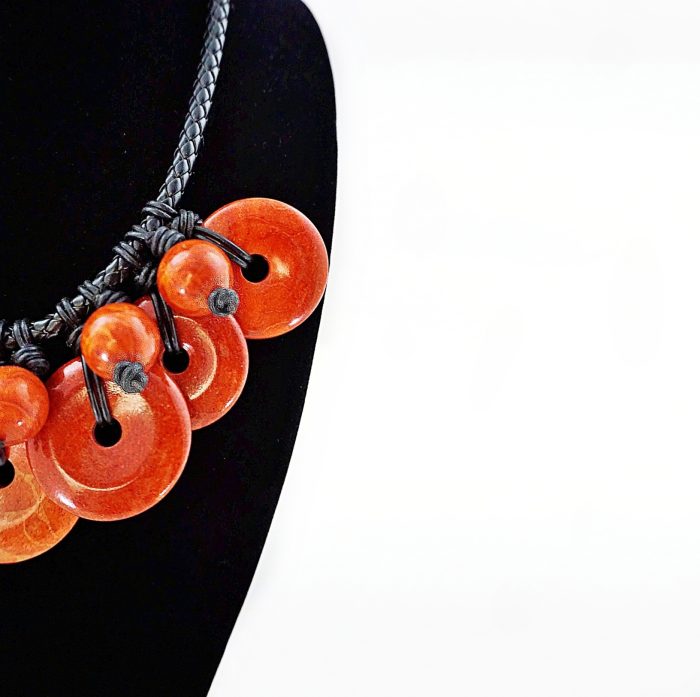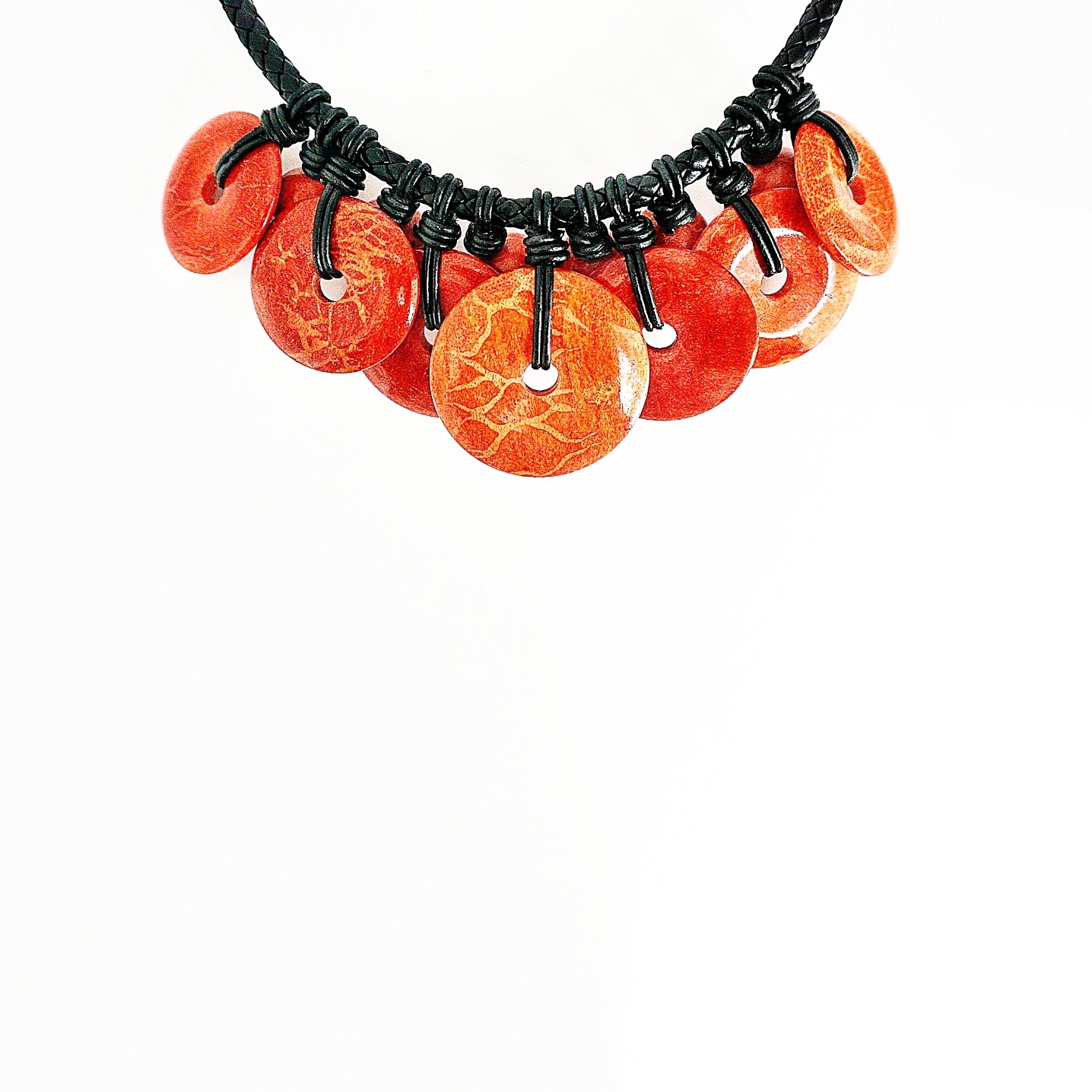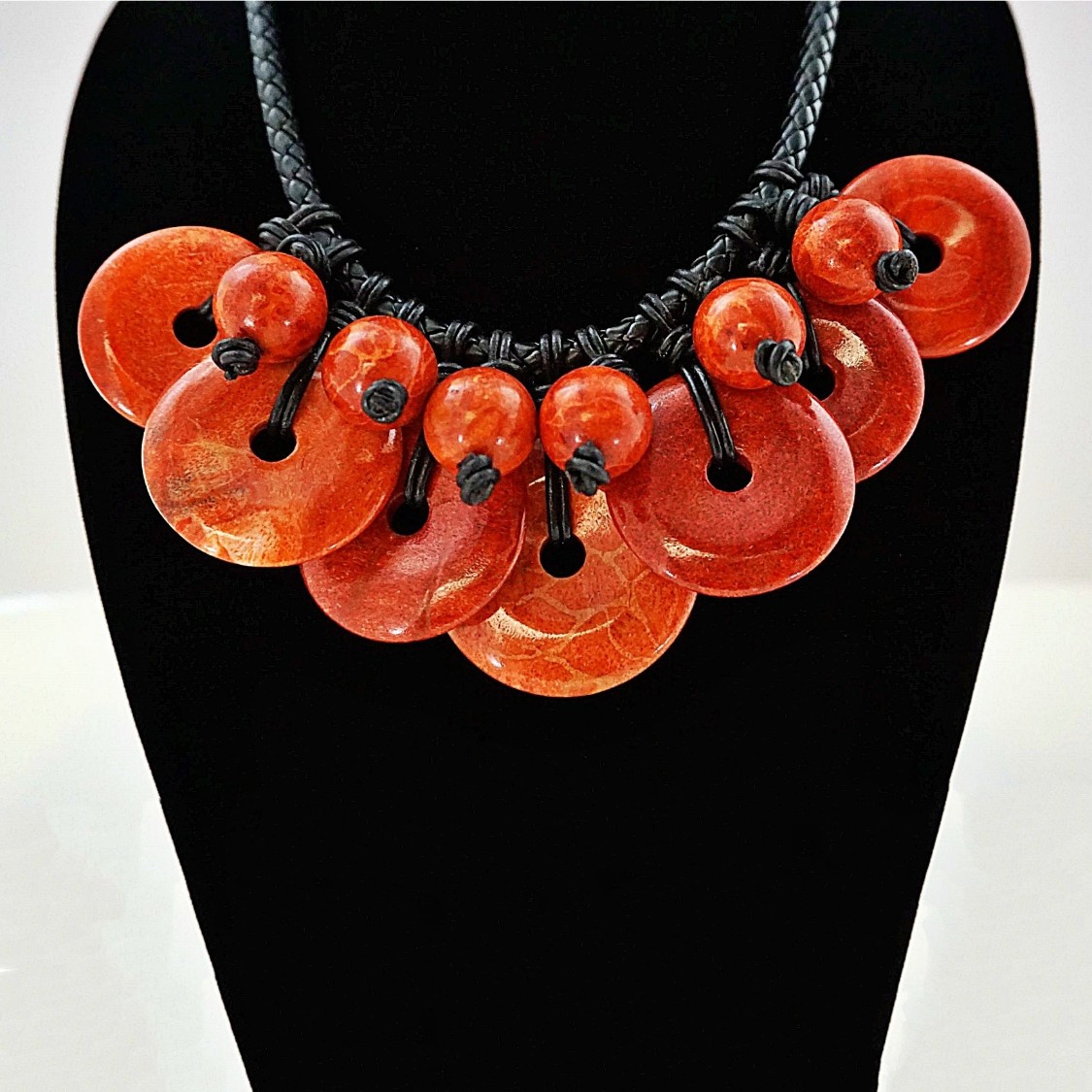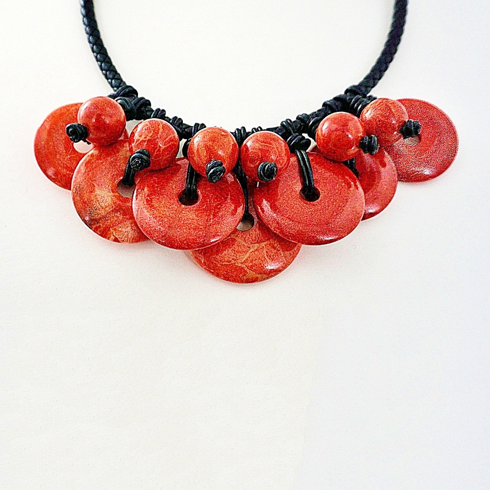 The red coral in this necklace has been polished. The veins which are visible throughout the coral are characteristic of its natural appearance. The polished black leather chain is a highly unusual and complex interpretation of braid work.
