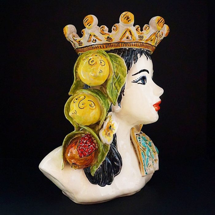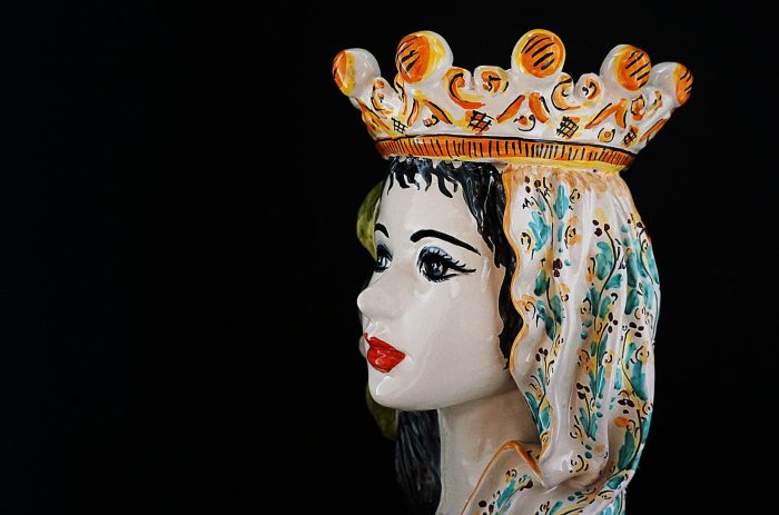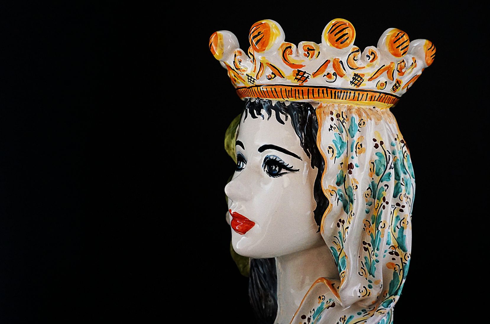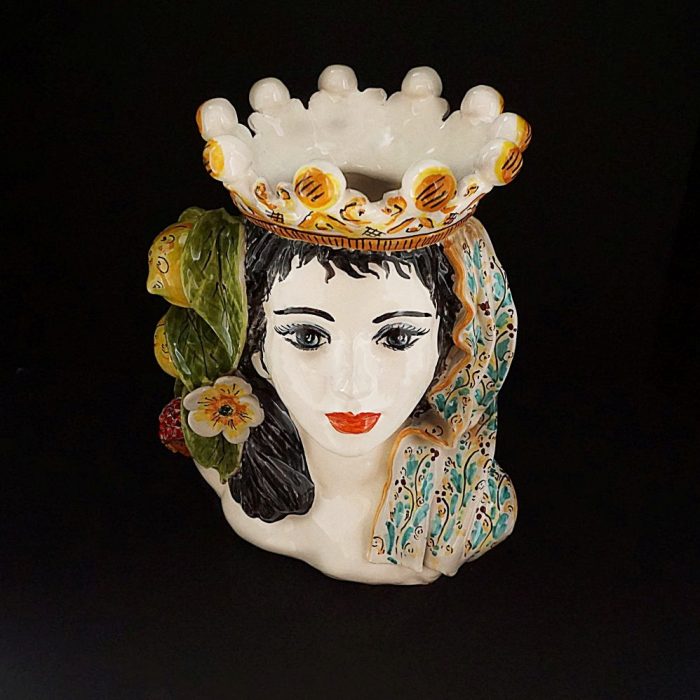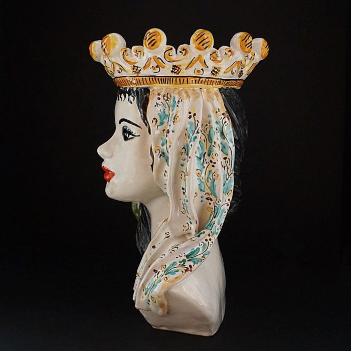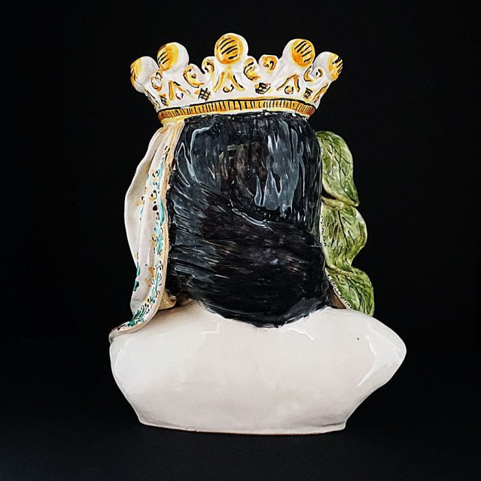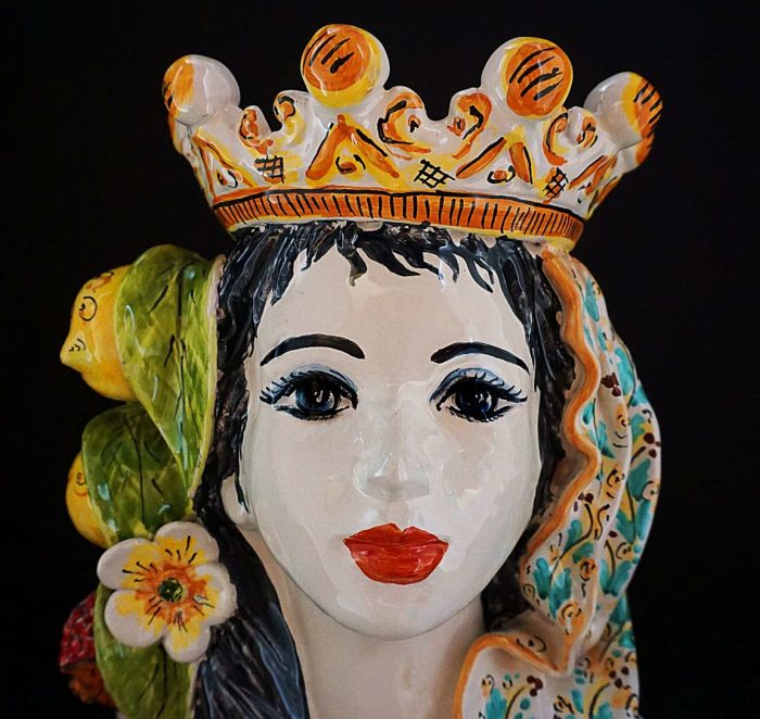 From that time, the fashion of making ceramic Moor and maiden heads spread throughout Sicily and Italy in general. Moor and maiden heads became symbols of fertility and eternal love – a love in which two people can be together forever. These heads have become a feature of many terraces and gardens throughout Italy. Typically these heads feature richly decorated Moorish wedding turbans. Fabrics with elaborate designs adorned with succulent fruits symbolizing fertility and growth – all rendered in glazed ceramic – characterize these turbans. Also, both the male and female heads are usually adorned with crowns. These crowns are a visual metaphor for the power of love to elevate man and woman to a regal standing.
