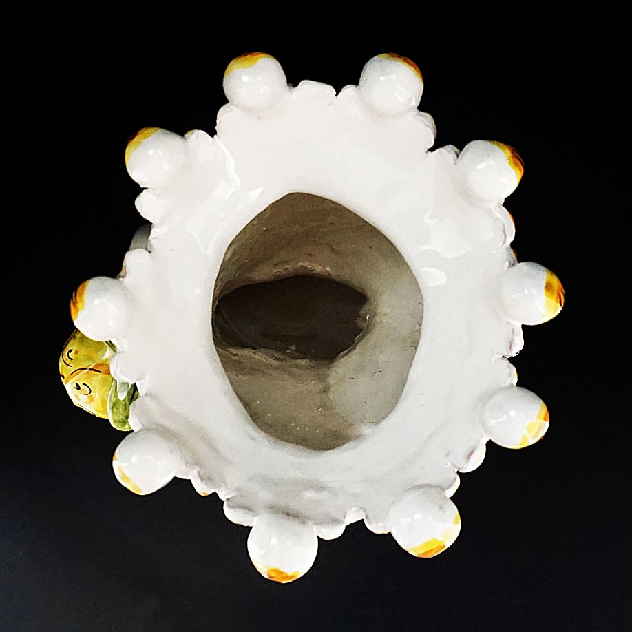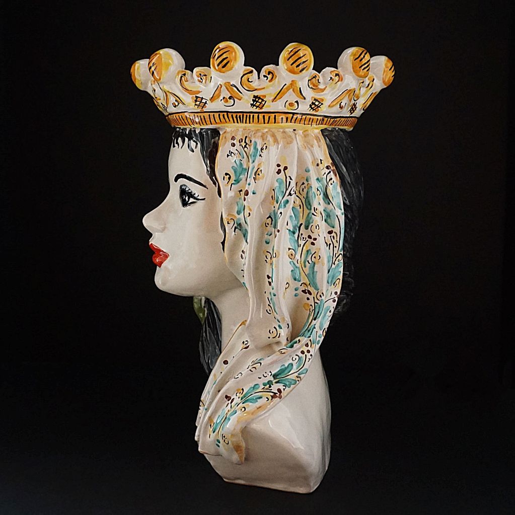 The most important place of production of these heads is at Caltagirone, Sicily, which has been a center for excellence in the production of fine ceramics for hundreds of years. Our maiden head featured here is a particularly beautiful and highly detailed example. It was hand sculpted, fired in a handmade kiln, hand painted and then fired once again in the same kiln by the most important and talented ceramicist in Caltagirone. This artisan produces singularly beautiful pieces of exceptional complexity and emotional expression.