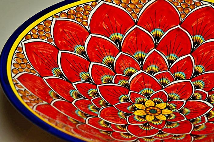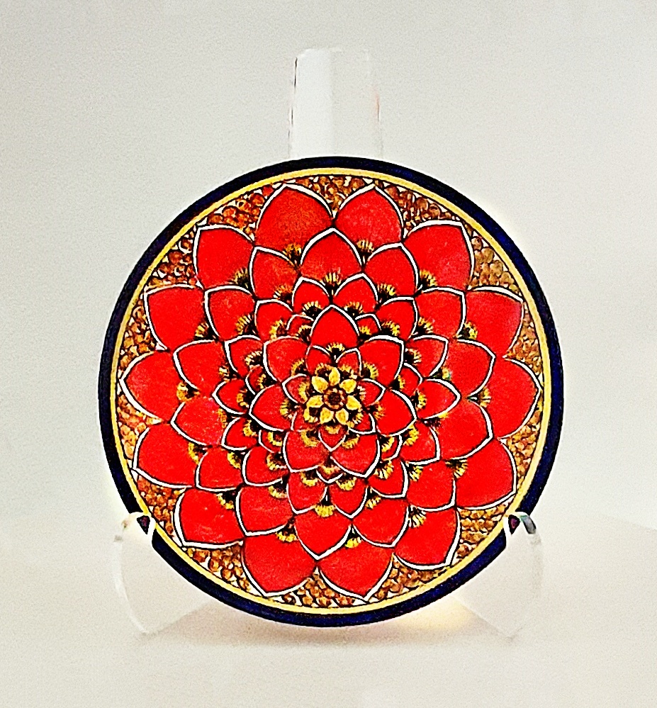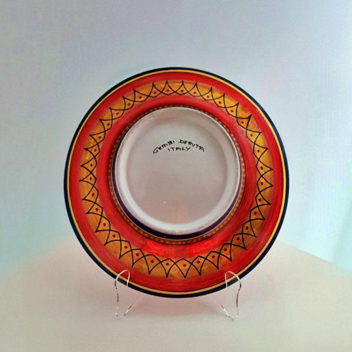 Center plate/decorative wall plate with a vibrant profusion of hand painted red petals and a special yellow center design completed by a blue circle. Turn it over and the backside is a surprising, unusual, geometric pattern of various colors.